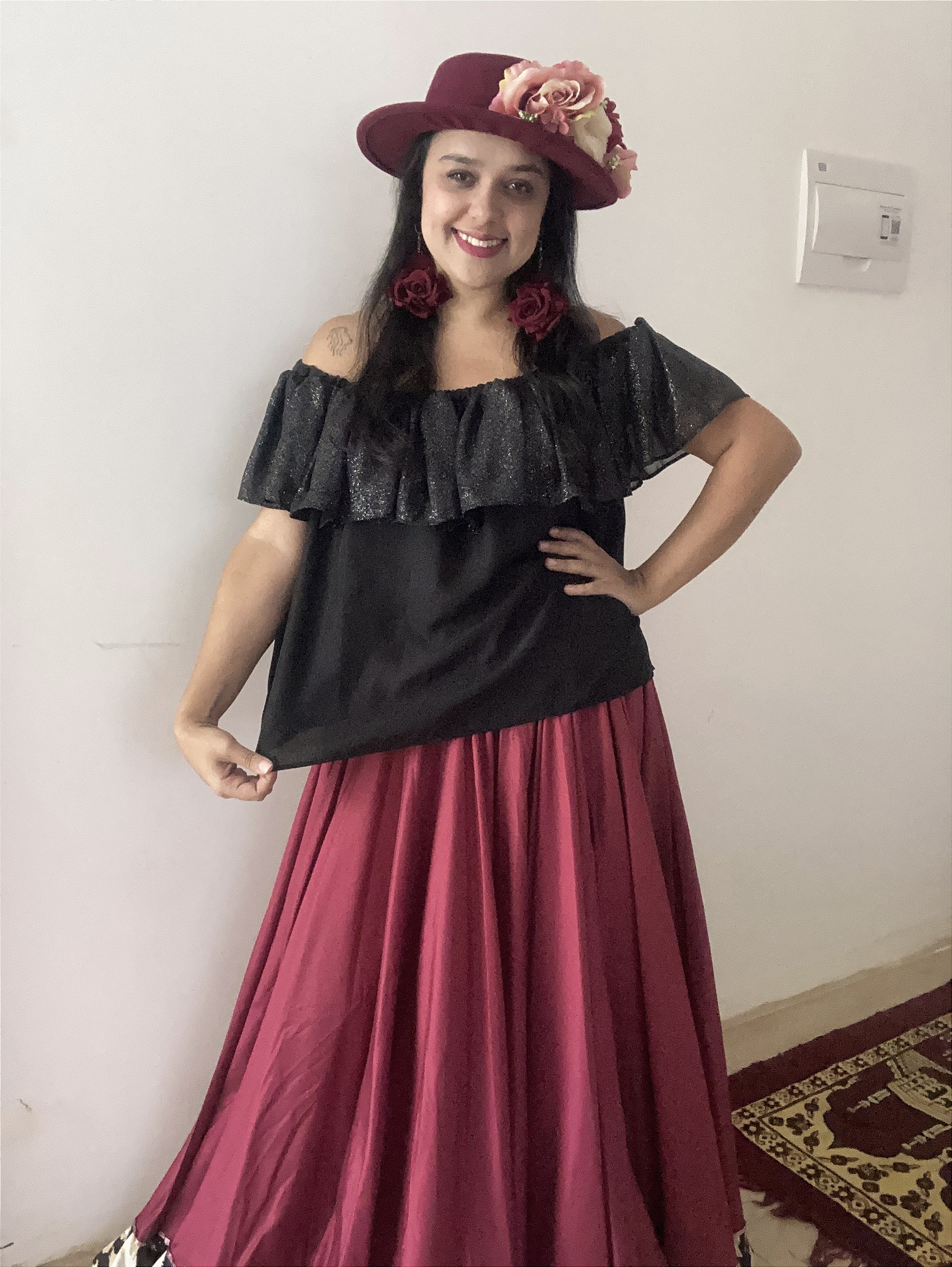 Blusa ciganinha confeccionada em crepe preto leve e fluido, trazendo elegância e conforto em cada movimento. O babado em tecido de glitter adiciona brilho e sofisticação, criando um visual marcante e cheio de presença, ideal para apresentações, festas ou composições ciganas modernas e reluzentes.