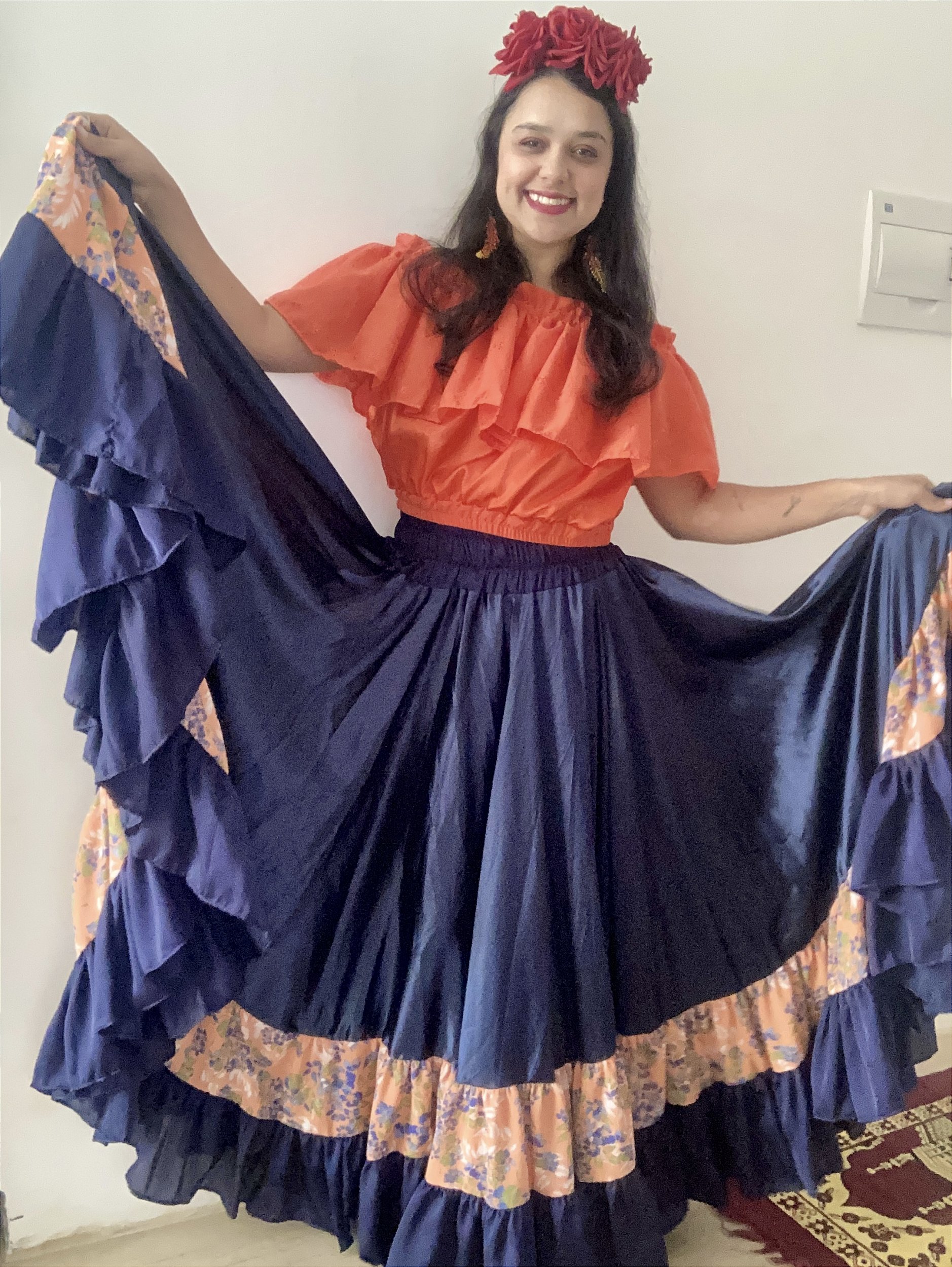 Com 20 metros de roda, esta saia oferece um caimento fluido e imponente, ideal para danças, rituais e celebrações. O cós de elástico largo e reforçado garante conforto e segurança, adaptando-se perfeitamente às medidas do corpo.