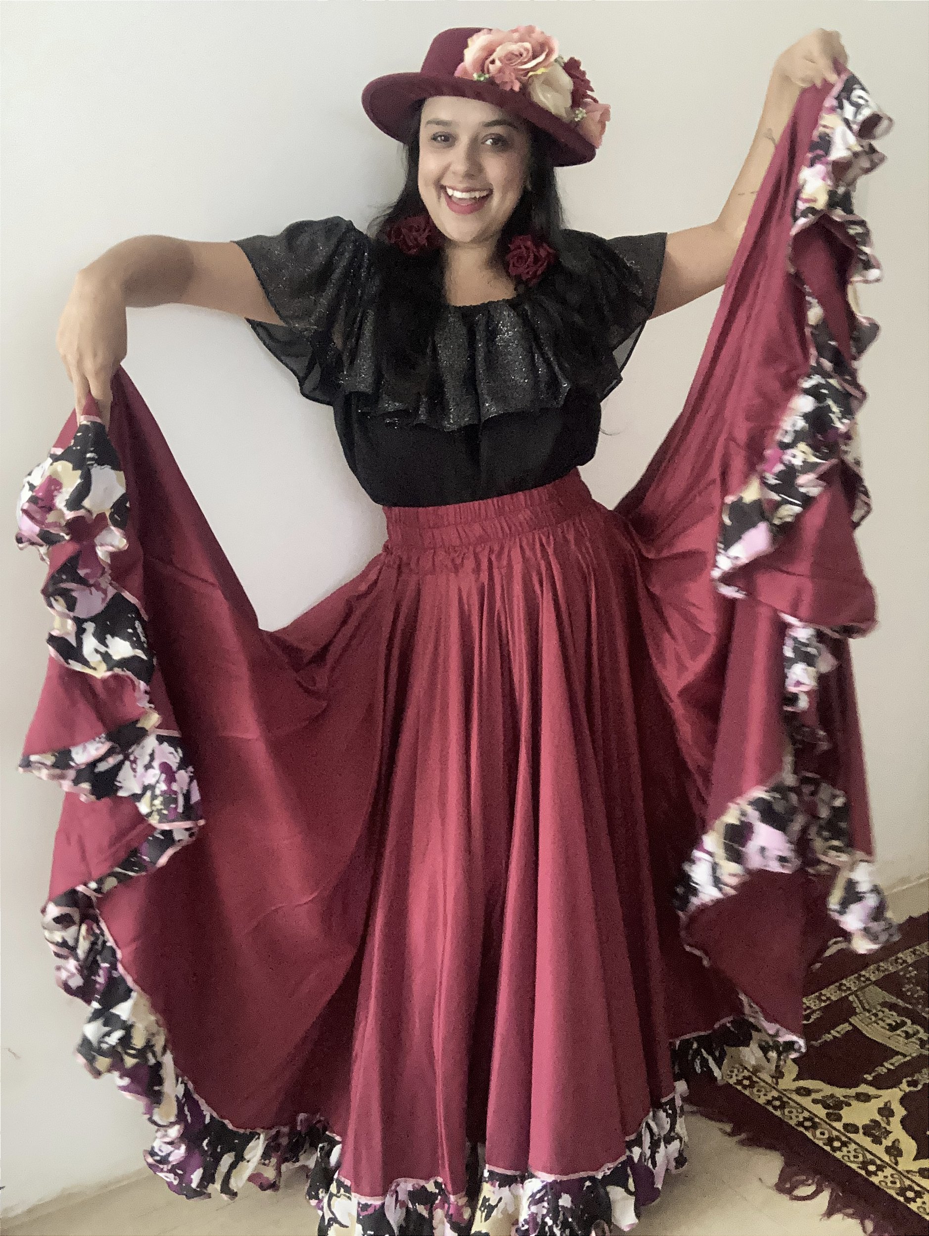 Saia cigana confeccionada em bember de leve brilho, unindo fluidez e elegância em um tom marsala profundo que transmite força e feminilidade. O babado estampado em padrão floral manchado adiciona contraste e movimento, resultando em uma peça rica em textura e presença, perfeita para giros amplos e danças cheias de expressão.