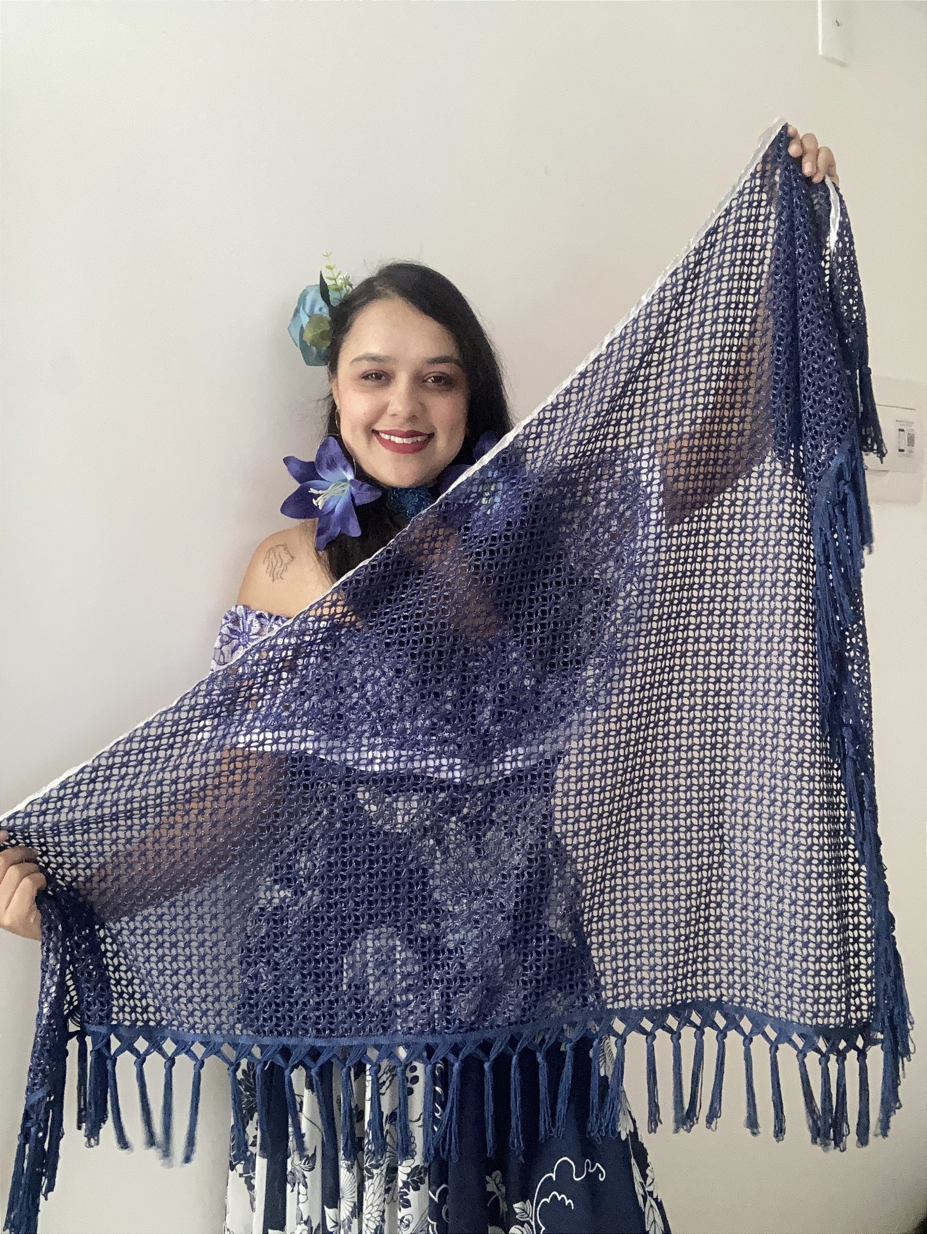 Xale cigano confeccionado em tricô de máquina, com fios na tonalidade azul cobalto e delicados detalhes metalizados em prata. A combinação das cores cria um efeito sofisticado e vibrante, refletindo a luz em cada movimento.